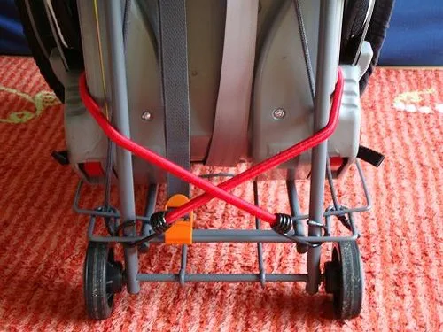Ho usato un cavo elastico (ho preso l'immagine di sfondo), ho trascorso la strada dalla cintura anteriore e ho appeso sul carrello dei bagagli. Altri hanno usato strisce o altri tipi di strisce. Ancora una volta, ogni volta che ti senti a tuo agio con la tua sicurezza, questo è buono. -